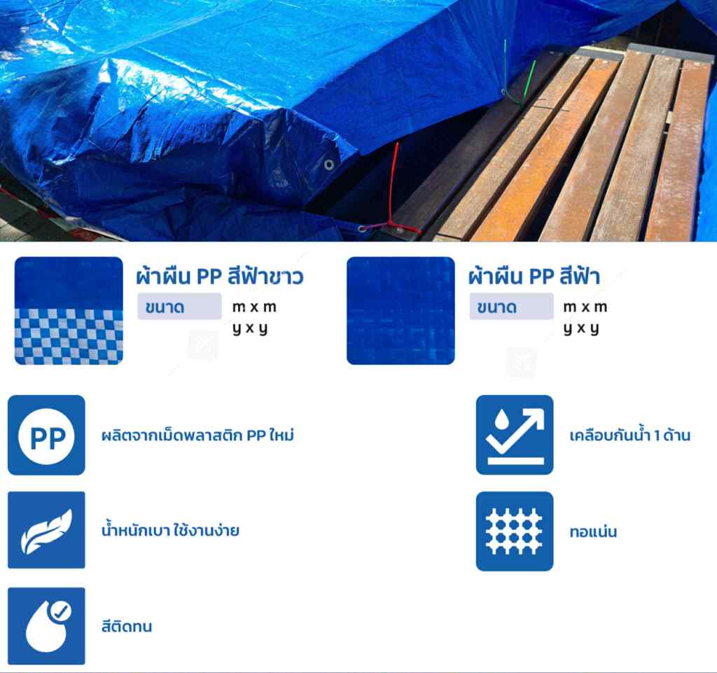 ผ้าผืน PP : PP Tarpaulin ผลิตจากเม็ดพลาสติก PP เคลือบกันน้ำ 1 ด้านเหมาะสำหรับปูพื้น คลุมสินค้า น้ำหนักเบา ราคาถูก เหมาะกับการใช้งานชั่วคราว และการใช้งานแบบงบประมาณจำกัด