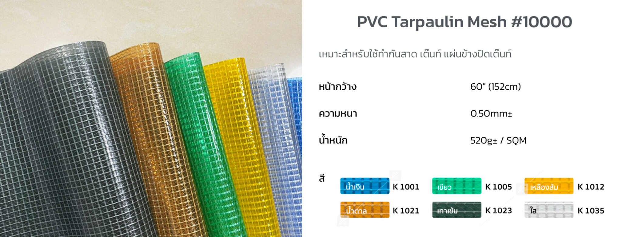 ผ้าสกายไลน์ / PVC Tarpaulin Mesh #10000 เหมาะสำหรับใช้ทำกันสาดแนวดิ่ง แผ่นข้างปิดเต๊นท์ ผลิตจากพลาสติก PVC เกรด A กันน้ำ 100% กึ่งโปร่งแสง ไม่ทึบ เสริมโครงสร้างตัวผ้าใบให้แข็งแรงด้วยเส้นด้าย Polyester สีสดสวย ติดทน ทำให้สถานที่ดูหรูหรา กันฝนได้อย่างดี และกันแดดกรองยูวีได้ แต่ไม่ทึบ มีความหนาถึง 0.50mm