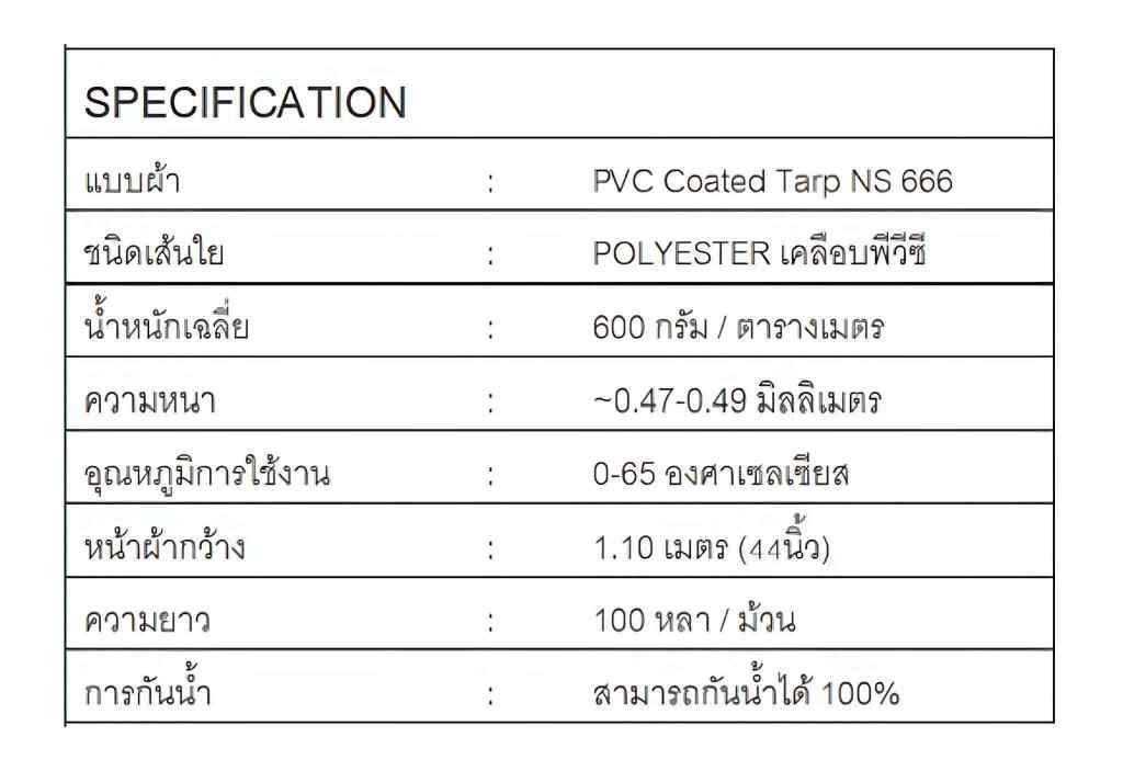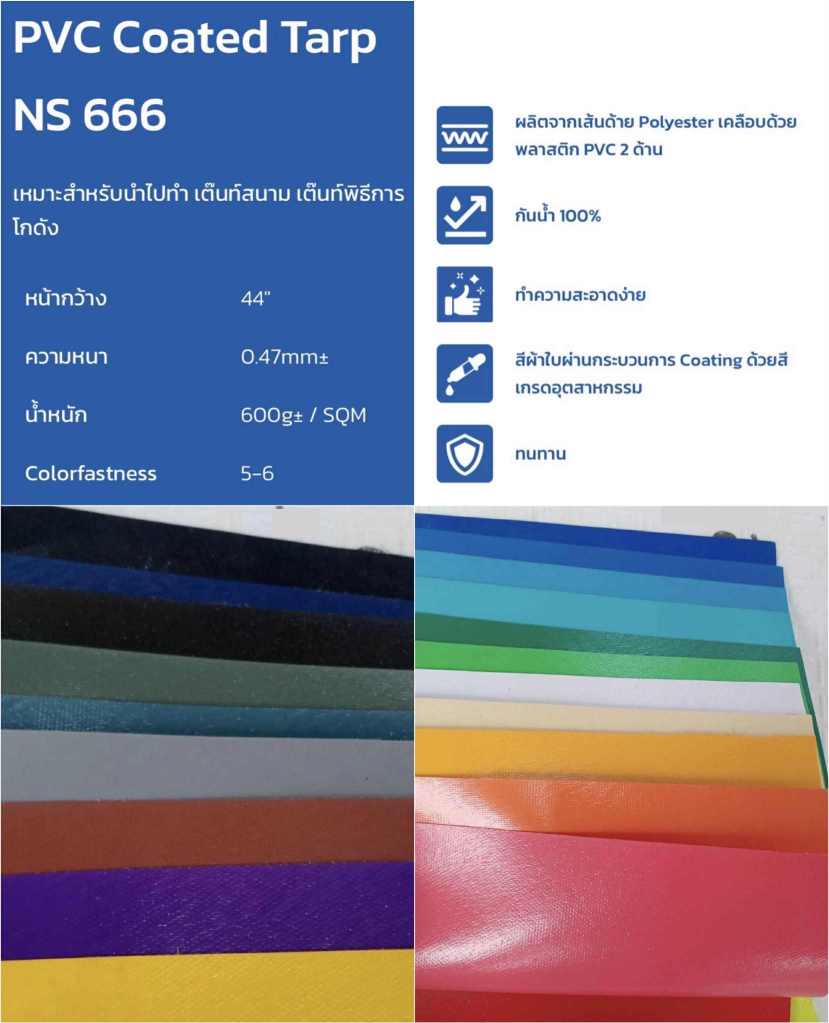 ผ้าใบเคลือบพีวีซี อายุการใช้งานยาวนาน สีสดใสทนนาน เหมาะทำกันสาดบ้านพักอาศัยและอาคารพาณิชย์ เต้นท์กันน้ำกันฝนผ่านได้ 100% กันแสงแดดได้อย่างดี ผิวเรียบเนียนมีความยืดหยุ่นทนต่อแรงดึง ทำจากเส้นใยโพลีเอสเตอร์ ทอแน่น เคลือบพีวีซีคุณภาพสูงทั้งสองหน้า มีความหนาถึง 0.47-0.50 มม.